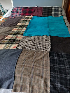 I made the wadding out of lots of samples of wool/wool mix fabrics and old woollen scarves, that I've had in my stash for ages. I just set the sewing machine to a zigzag stitch and stitched all the various sized pieces together until the whole was big enough. It didn't need to be particularly neat, as it's not going to be seen. I was really pleased to have done this, as it both saved me money buying wadding and also used up pieces of fabric that I don't like that much and haven't got any other use for. I've got lots more too. I remember buying a whole bin liner full of them from a fabric warehouse for £1, probably 10 years ago. I may use more of them for future quilt project wadding. I'll post a picture when I do a quilting update post.